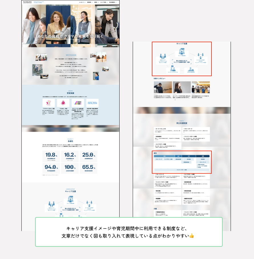 最近では、福利厚生は「あって当たり前」ですが、そんな中でも出産などのライフイベントに合わせた柔軟な働き方ができることの訴求や、仕事と育児を両立しながらでも、しっかりとキャリアが築ける点を訴求するコンテンツが増えてきたように思います。