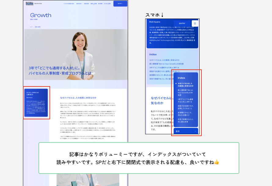 単なる制度紹介にとどまらず、社員の育成に関する制度をインタビュー形式の1本の記事にして、人材育成への本気度が伝わる内容になっている。成長への「投資」というワード選定も、熱量が伝わります。