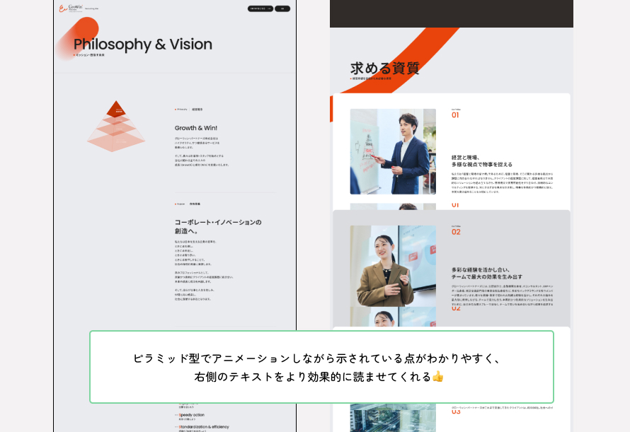 理念やパーパスにこめた「想い」の部分まで伝えることで、理念や方針により共感してくれる人へ入社してもらえるような構成になっていると感じました。また、求める「資質」という表現も、「求める人物像」よりスマートで即戦力のある人物を求めている、企業の経営に携わるコンサルティング会社らしい雰囲気が伝わってきました。