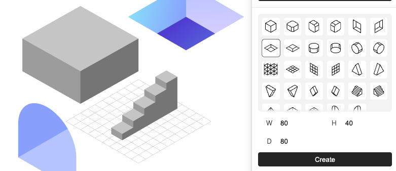 幅、高さ、奥行きを設定し、オブジェクトを選んで「Create」ボタンを押すと、指定したサイズの3Dオブジェクトを作成することができます。